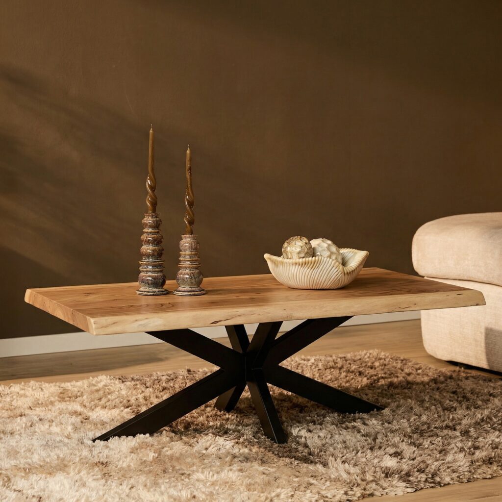 Boomstam salontafel Live Edge is gemaakt van acaciahout en metaal. Het tafelblad bestaat uit verschillende stroken acaciahout, waardoor geen enkele tafel hetzelfde is. Het massieve blad is gecoat. Afmeting Breedte: 120 cm Diepte: 60 cm Hoogte: 45 cm Dikte blad: 3,5 – 4,5 cm Afmeting matrixpoot Breedte: 8 cm Diepte: 4 cm