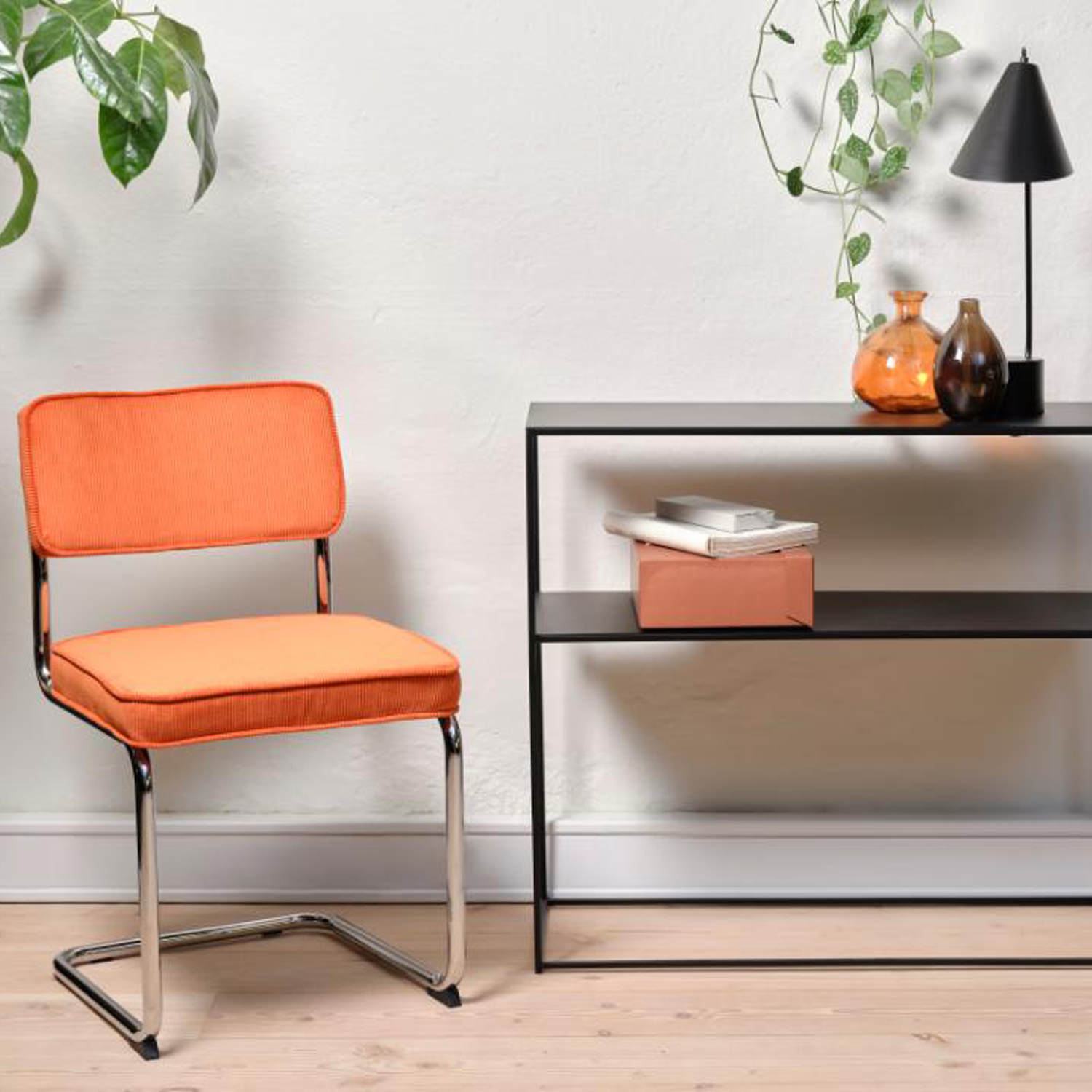 De eetkamerstoel Roberto Rib Oranje is een stijlvolle en comfortabele toevoeging aan elke eetkamer. Het frame van de stoel is gemaakt van duurzaam metaal en heeft een verchroomde afwerking, wat niet alleen zorgt voor stevigheid maar ook een moderne uitstraling geeft. De bekleding van de stoel is vervaardigd uit zachte ribstof in een frisse oranje kleur, waardoor het niet alleen een visueel aantrekkelijke keuze is, maar ook een comfortabele zitervaring biedt. De combinatie van het zilveren frame en de oranje bekleding geeft de stoel een eigentijdse en verfijnde uitstraling, waardoor het een uitstekende keuze is voor een stijlvolle eetkamerinrichting.