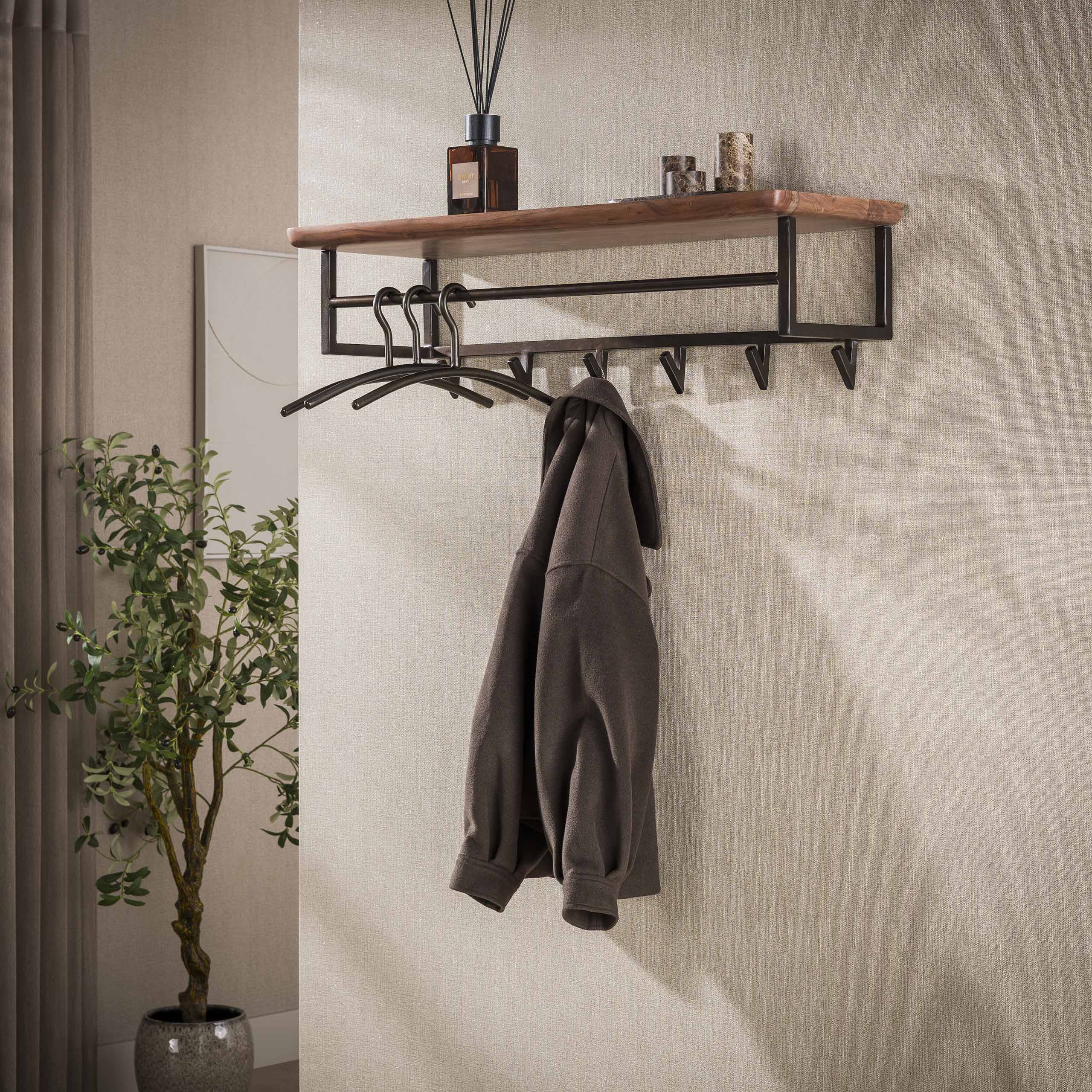 De Kapstok Edge Curve heeft 6 haken en is gemaakt van massief acacia hout met een warme, bruine afwerking. Het ontwerp combineert functionaliteit met een natuurlijke uitstraling, ideaal voor elke binnenruimte.
