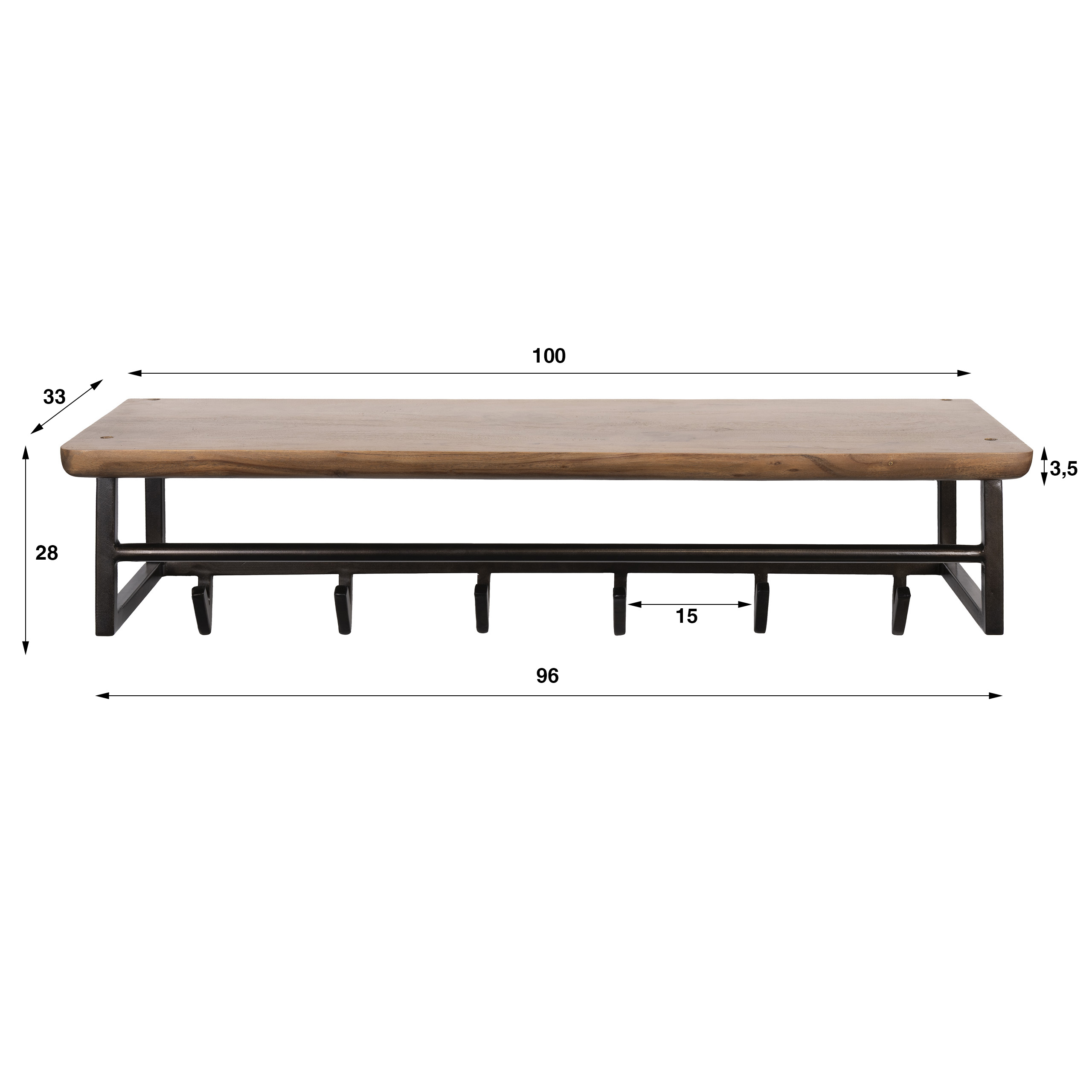 De kapstok heeft een breedte van 100 cm en een hoogte van 28 cm, waardoor deze compact en ruim genoeg is voor jassen en accessoires. Met een gewicht van 9 kg staat hij stevig aan de muur bevestigd.