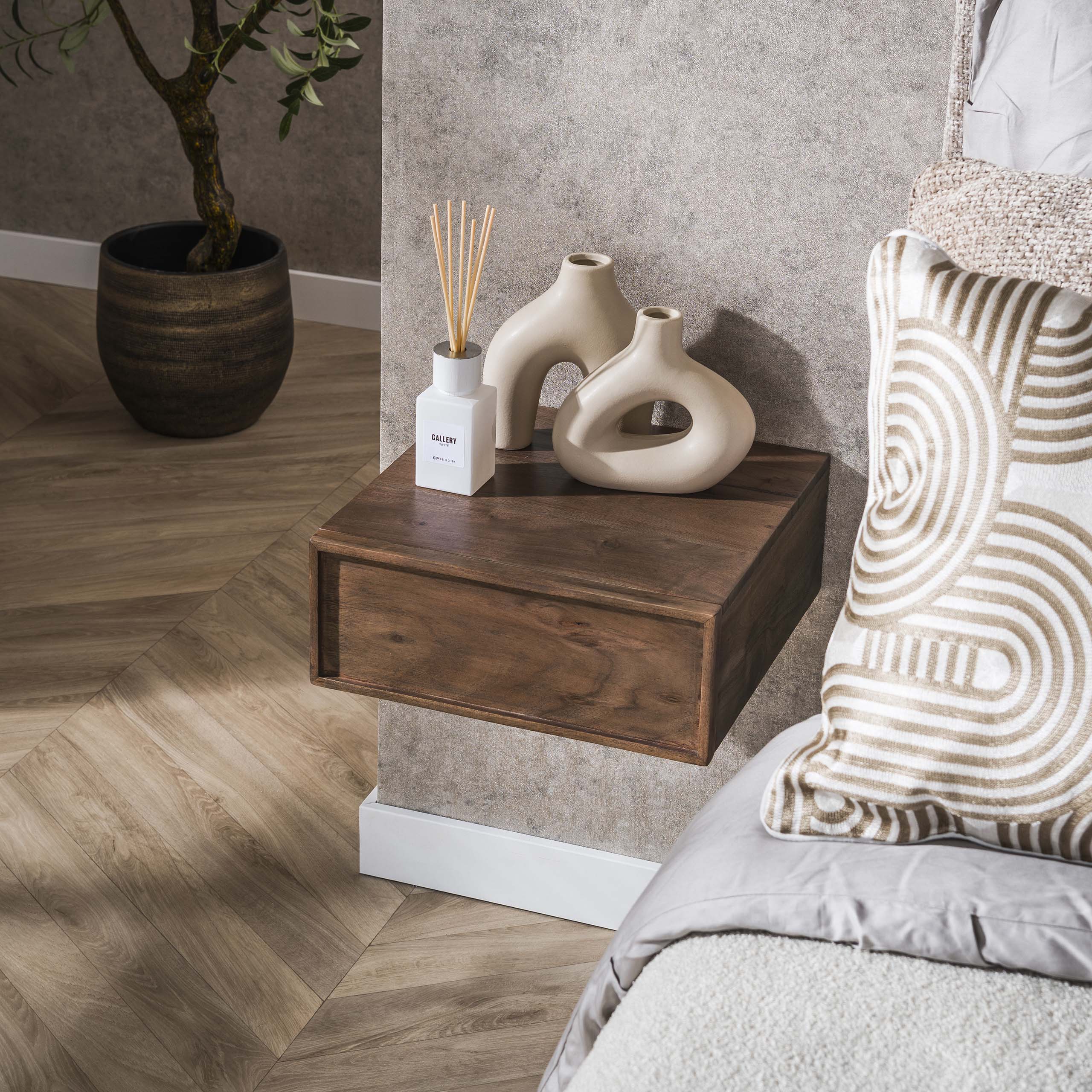 Het Nachtkastje Frame is vervaardigd uit massief acaciahout in een warme bruine kleur. Met een compacte afmeting van 35×35 cm past het perfect naast elk bed zonder te veel ruimte in te nemen. Dit zwevende nachtkastje biedt een moderne en stijlvolle uitstraling dankzij het minimalistische ontwerp.