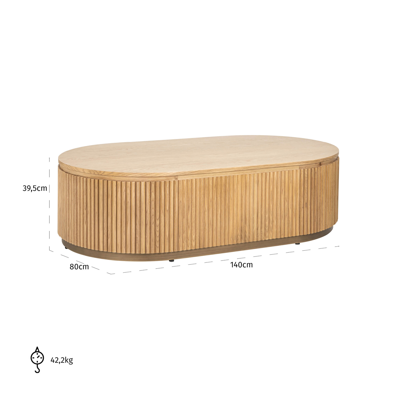 De salontafel wordt volledig gemonteerd geleverd, waardoor u direct van het product kunt genieten zonder zelfmontage. Dit gebruiksgemak maakt het een praktische keuze voor iedereen die op zoek is naar comfort en stijl. De afwerking benadrukt het natuurlijke karakter van het hout.