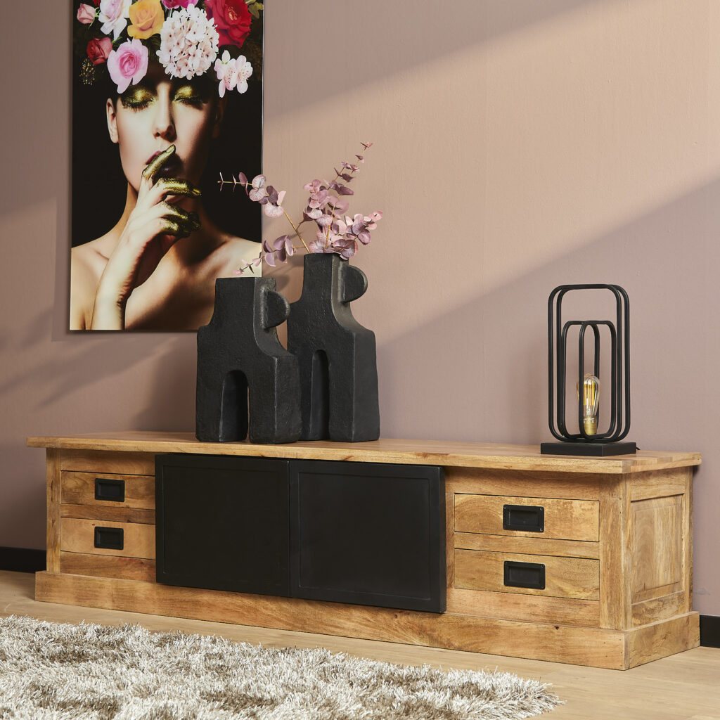 Tv meubel Nashville is uitgevoerd in gelakt mangohout in combinatie met een zwart gelakt metalen deuren. Dit model is voorzien van twee deuren en vier lades. Deze kast is ingelegd met verschillende stroken hout, waar het meubel zijn eigentijdse karakter aan te danken heeft. Afmetingen Breedte: 200 cm Diepte: 45 cm Hoogte: 50 cm Onderhoud: Afnemen met een lichtvochtige doek.